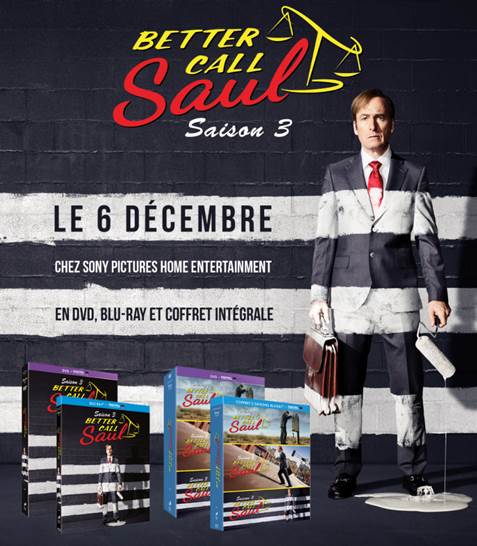 À l’occasion de la sortie en vidéo de la très bonne saison 3 de BETTER CALL SAUL, LE BLEU DU MIROIR et Sony Pictures Home Entertainment sont heureux de vous offrir 1 coffret DVD et 1 coffret blu-ray de la troisième saison. Pour gagner, il vous suffit d’envoyer vos coordonnées postales avant le 21 décembre 2017 avec la bonne réponse. C’est un tirage au sort qui désignera le gagnant parmi les candidats ayant répondu correctement à la question (par vrai ou faux) et ayant justifié de leur motivation par quelques mots sur le film. Devenez fans sur Facebook, suivez-nous sur Twitter ou partagez ce jeu sur les réseaux sociaux et doublez vos chances de gagner.